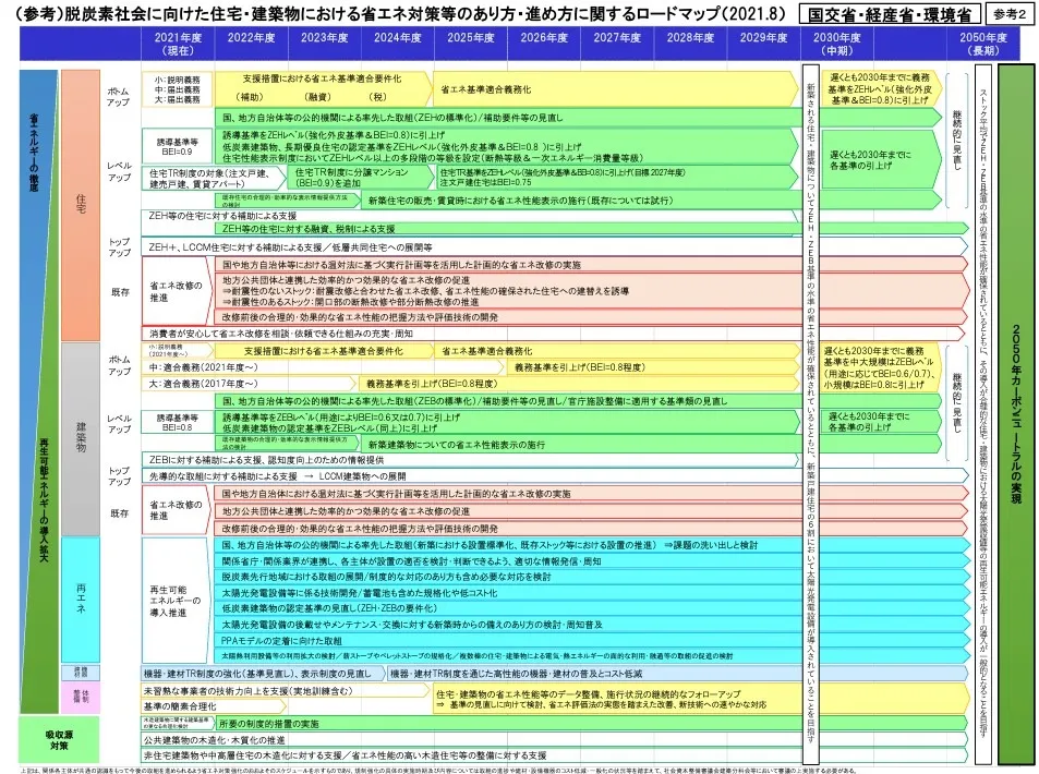 (参考:2050年カーボンニュートラルの実現に向けた住宅・建築物の対策をとりまとめ~「脱炭素社会に向けた住宅・建築物における省エネ対策等のあり方・進め方」の公表 ~:https://www.mlit.go.jp/report/press/house04_hh_001027.html)